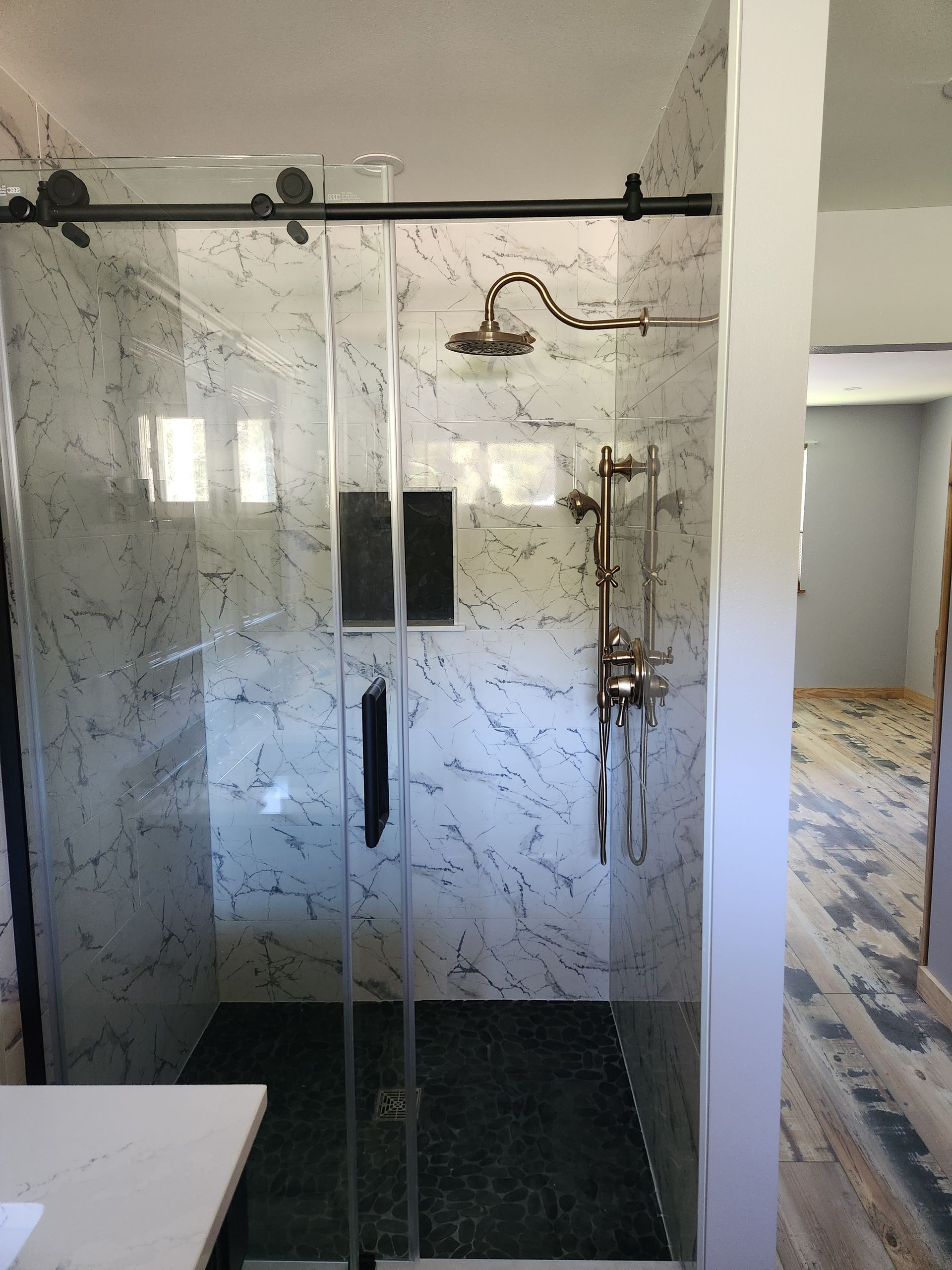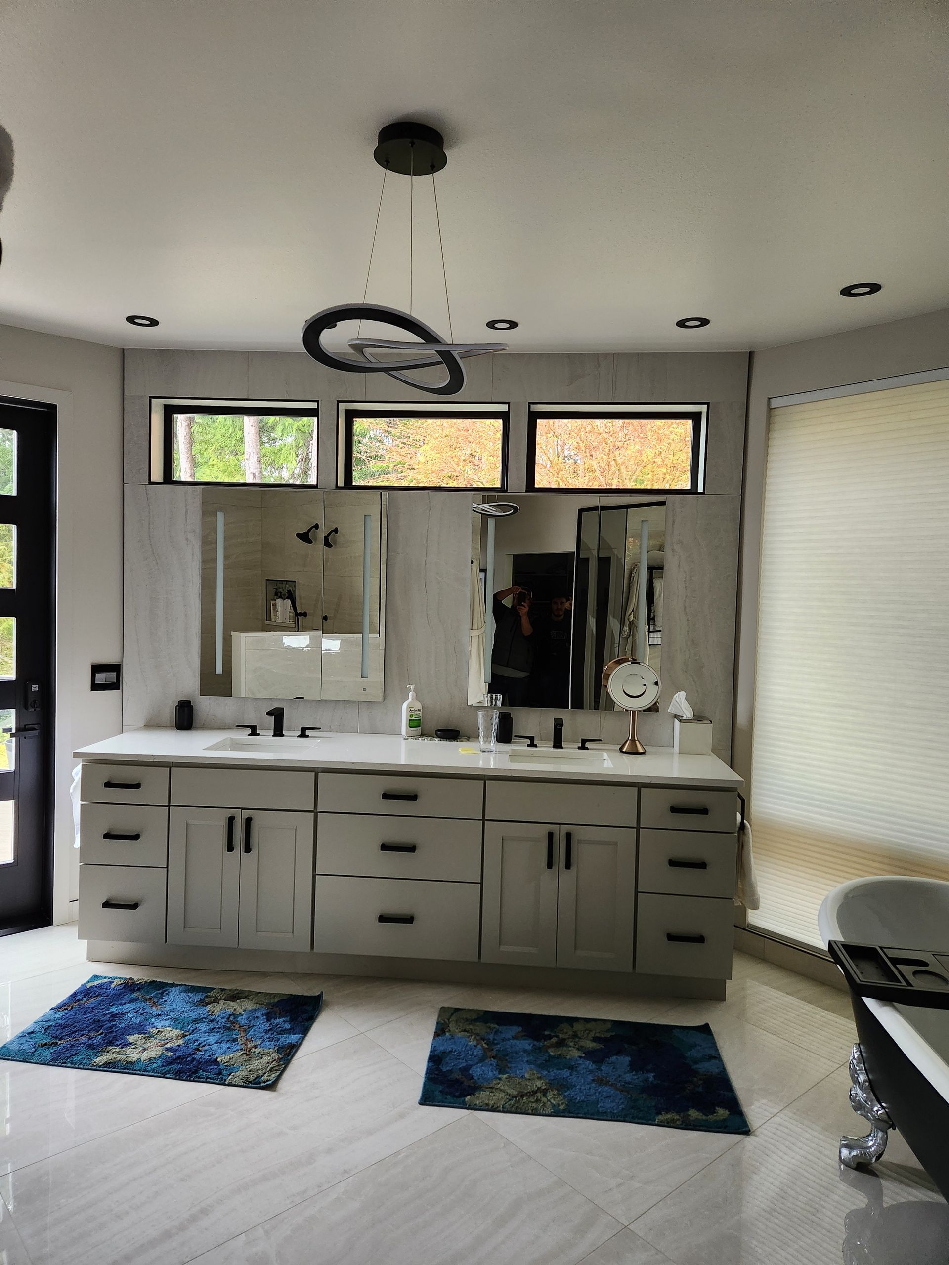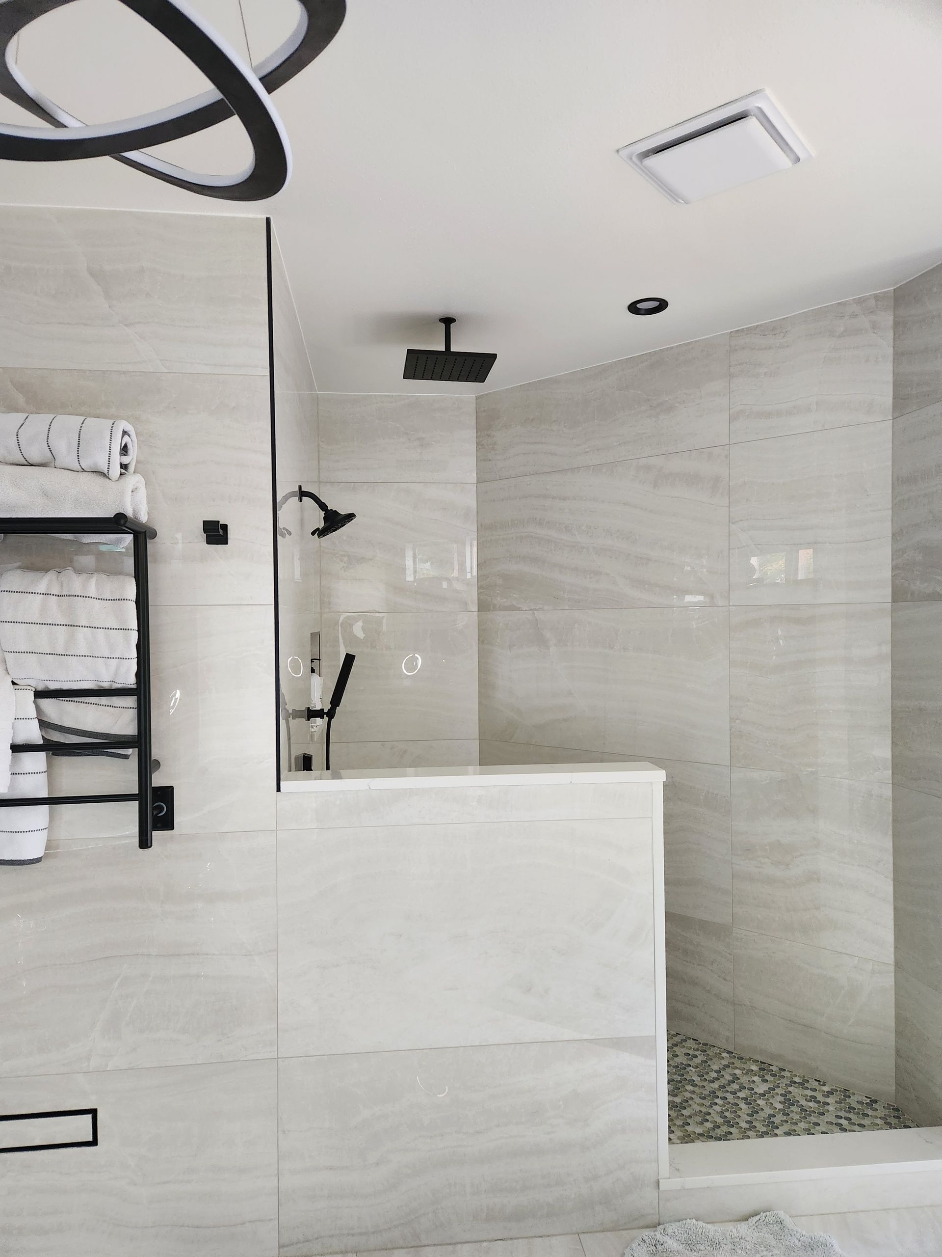 - Bathroom renovations featuring walk-in showers, vanities, tile, and lighting