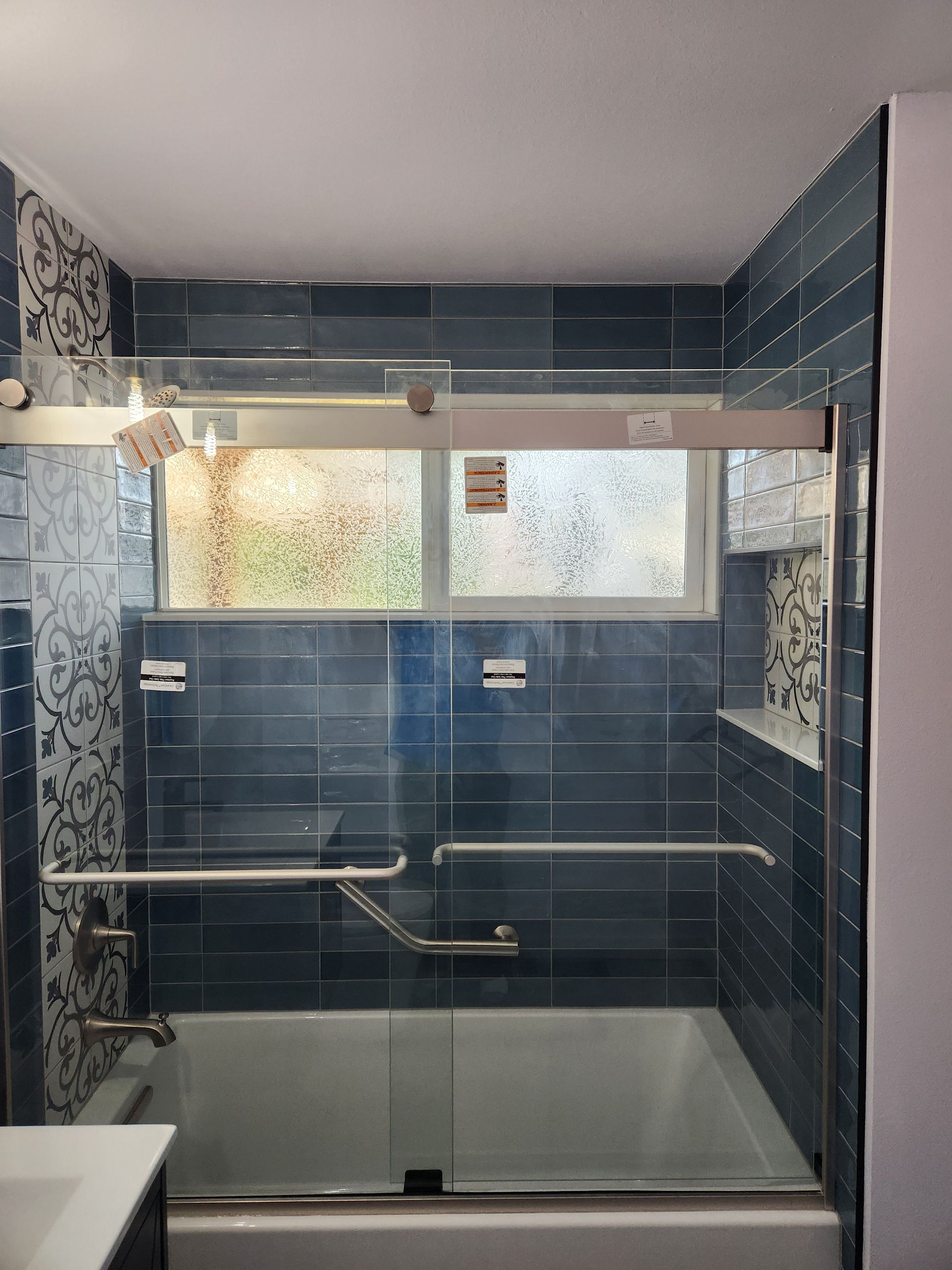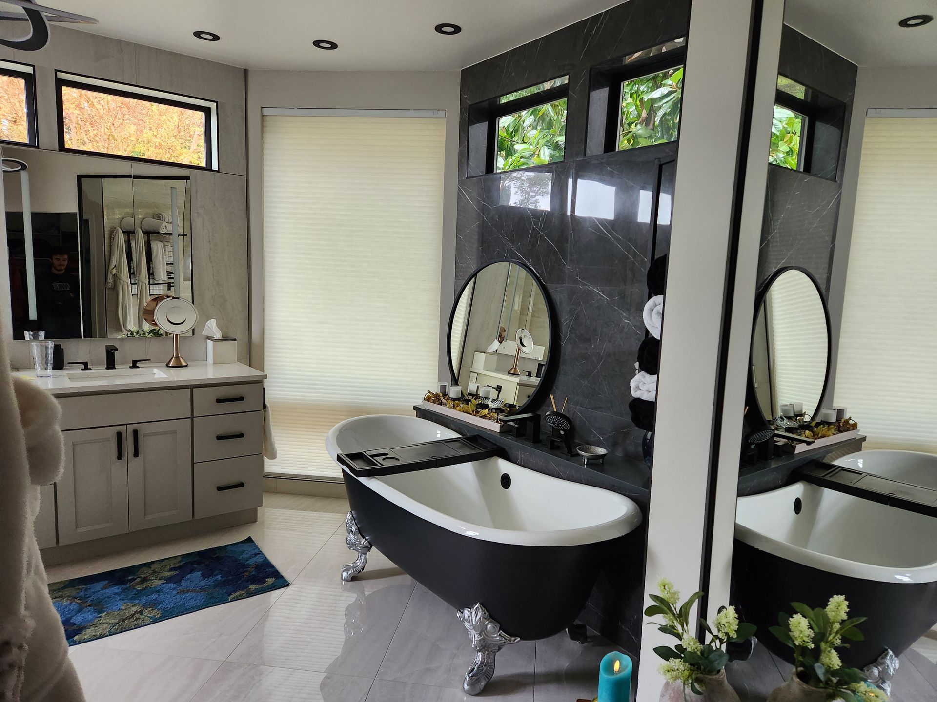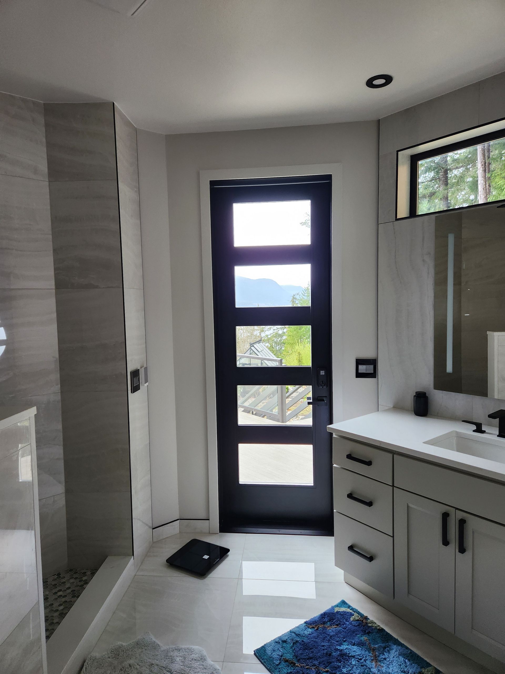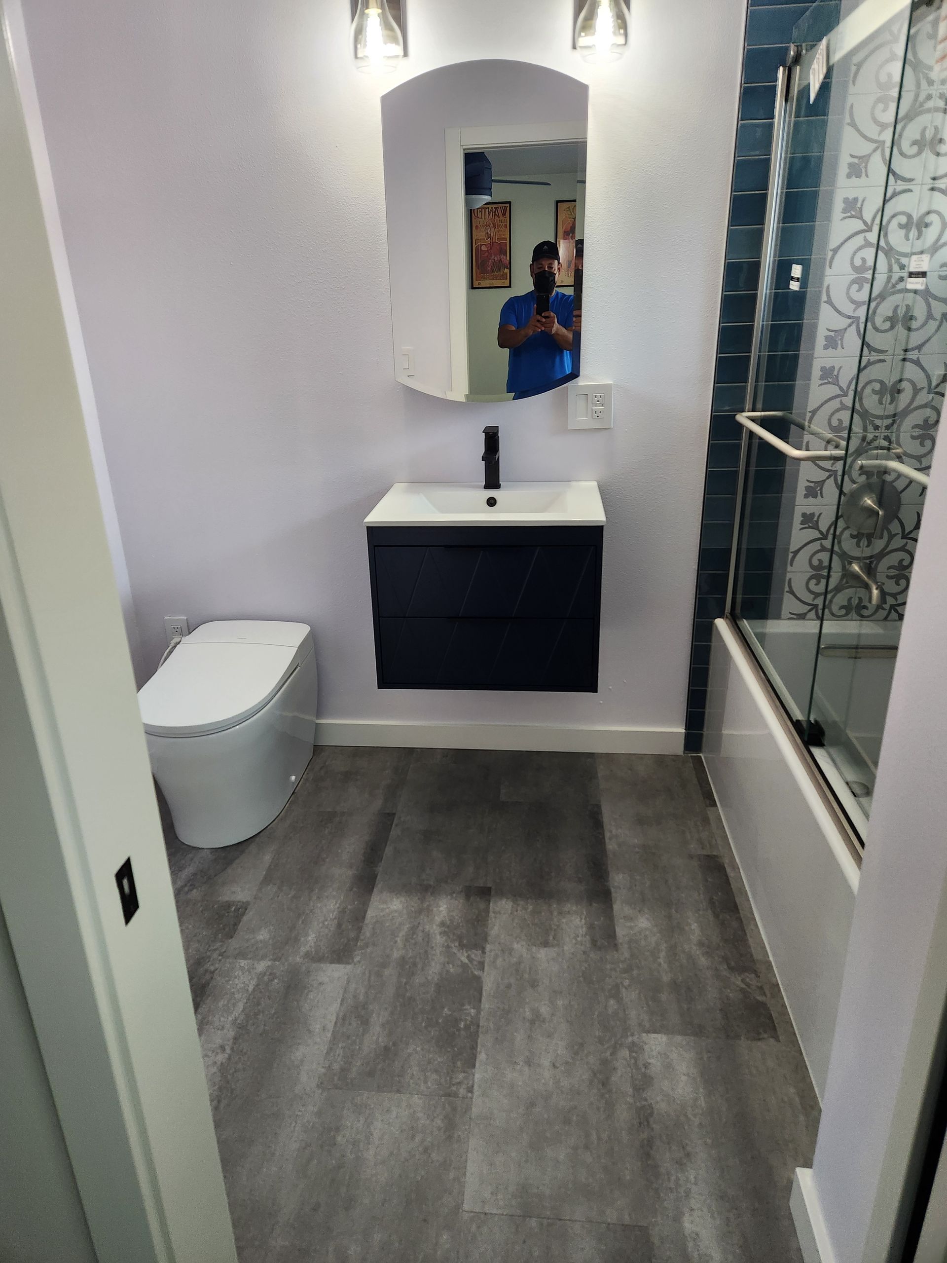 - Bathroom renovations featuring walk-in showers, vanities, tile, and lighting